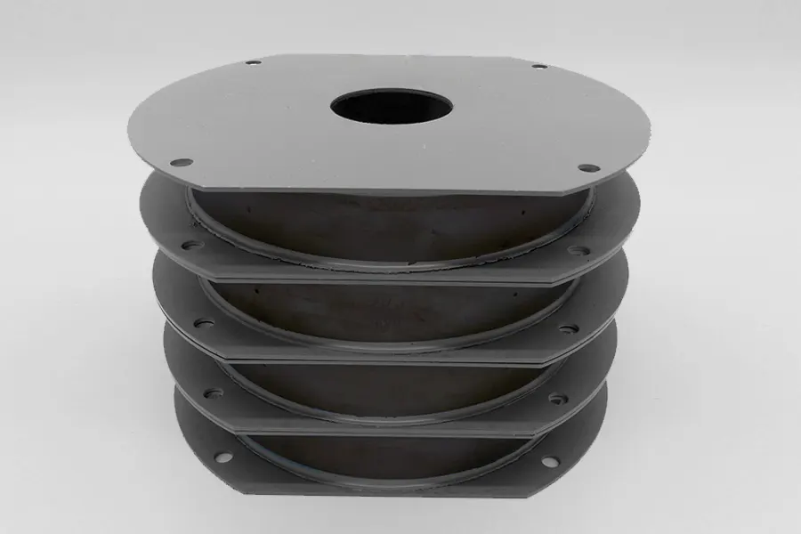 Bei unseren De-ell Gummi-Metall-Verbindungen ist der Gummikörper (aus Kautschuk u. Elastomeren in Spezialmischung nach erforderlichem Druckwert) zwischen zwei Stahlblechronden einvulkanisiert.